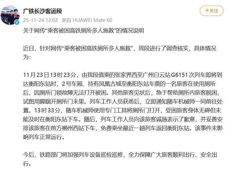 11月24日,中国铁路广州局集团有限公司长沙客运段官博发布对于网传“乘客被困高铁茅厕多东谈主施救”的情况评释。