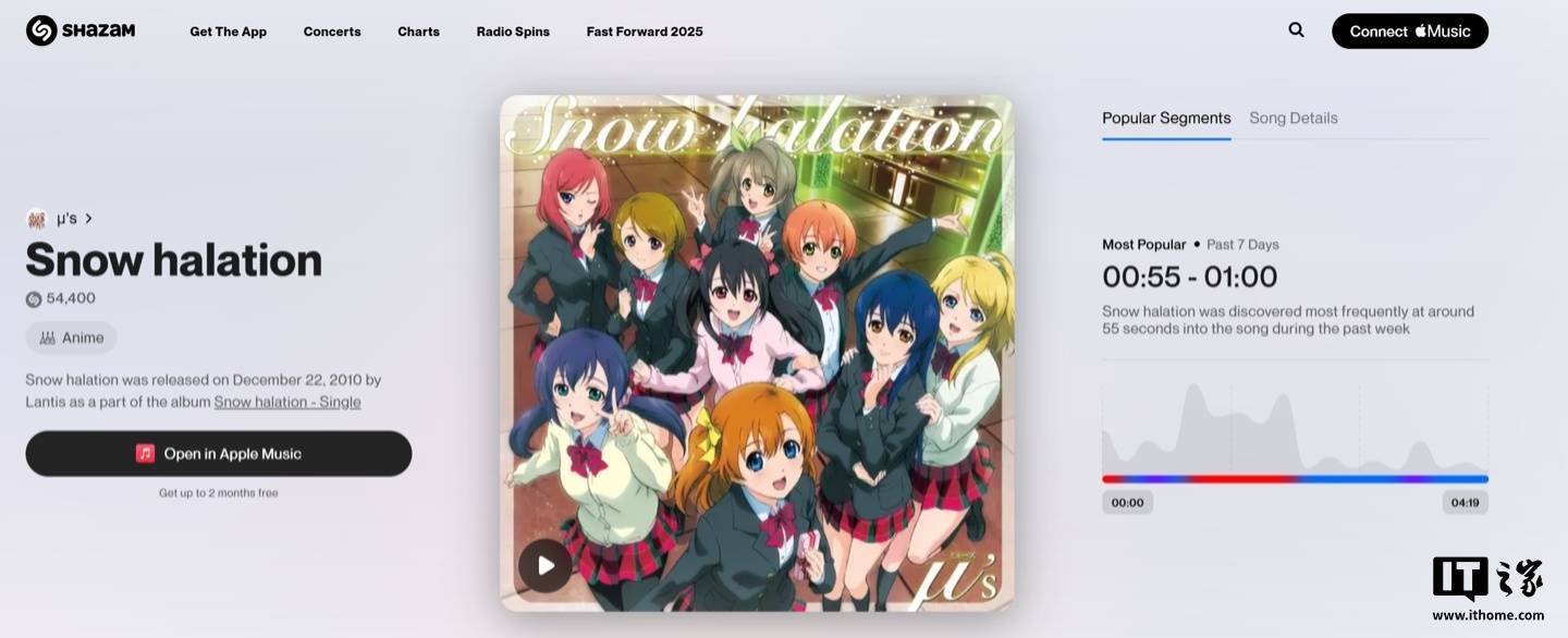 IT之家对此进行实测,该功能已在网页版 Shazam 中上线,以 μ's 的《Snow halation》为例,最近一个星期内大部分听众会在 55 秒至 1 分钟整时翻开 Shazam 识别歌曲,同期 55 秒到 1 分钟 40 秒的热力值最高,裸露大部分听众会平直跳转到这一部分。