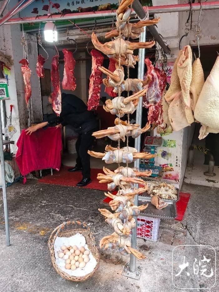 r大皖新闻记者当先来到位于六安市开脱北路的百花菜市集。在市集北收支口的肉类商铺门口,挂着两串腌制好、正在曝晒的鹅肫鹅爪,个头较大。“这是大鹅肫爪,你看这爪子多大!忠诚思要的话,1副48元,1串10副,480元,8斤傍边。”该商铺雇主说。