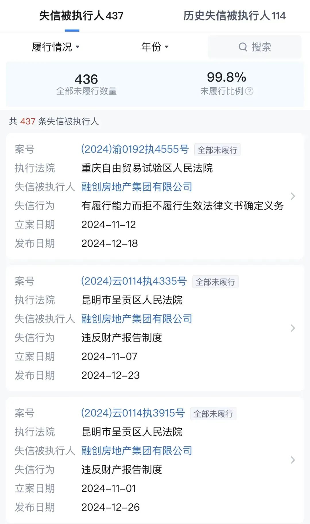 同期,领域2024年11月30日,融创房地产新增10项失信“老赖”行径,累计437条。