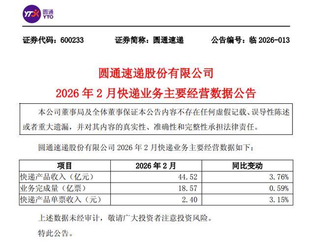 把柄公告显露,圆通速递2026年2月快递家具收入为44.52亿元,同比增长3.76%;业务完成量达18.57亿票,同比增长0.59%;快递家具单票收入为2.40元,同比增长3.15%。公告同期指出,上述数据未经审计,敬请巨大投资者郑重投资风险。