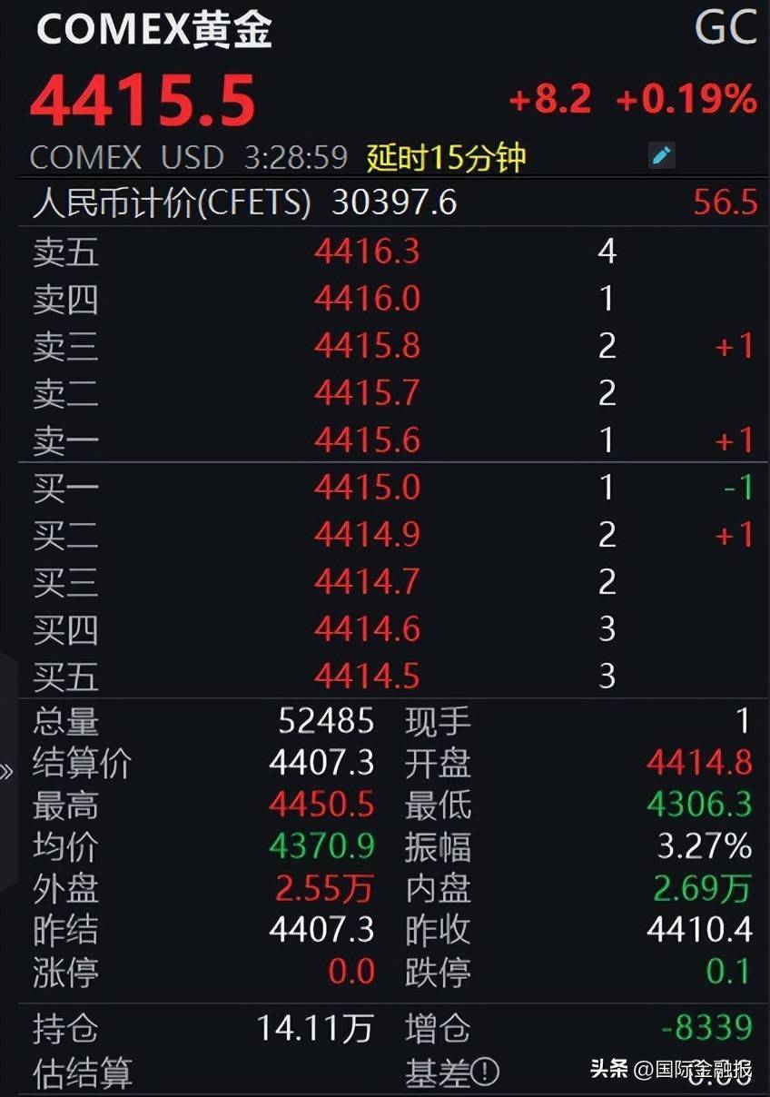 期货阛阓同步呈现先抑后扬走势。甩掉记者发稿,COMEX黄金期货日内微涨0.19%,报4415.5好意思元/盎司,盘中最低下探至4306.3好意思元/盎司,最高一度涉及4450.5好意思元/盎司,与现货阛阓走势保持联动。