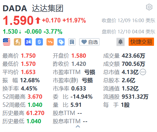 达达集团(DADA.US)盘前跌3.77%,报1.53好意思元。瑞穗证券分析师Wei Fang保管达达集团买入评级,并将主见价从4好意思元下调至3.5好意思元。(格隆汇)