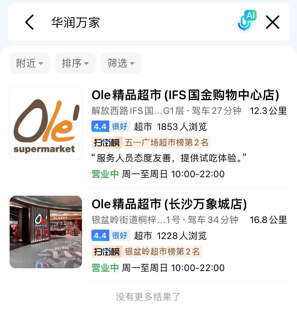 记者在舆图上搜索华润万家,夸耀当今长沙仅有2家Ole极品超市。