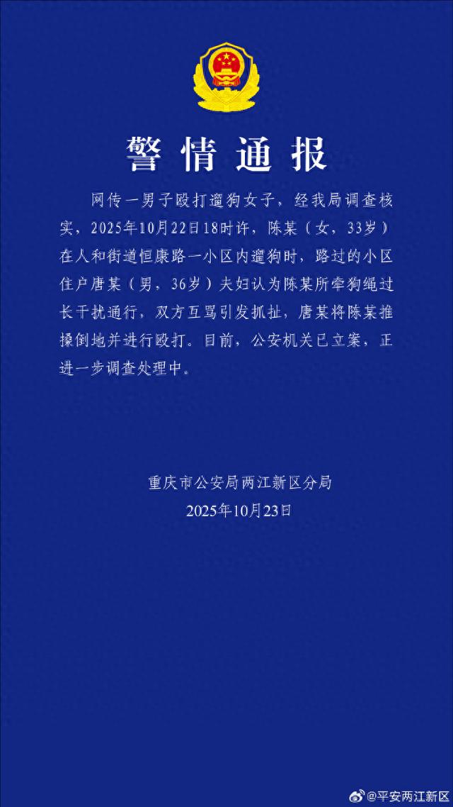 网传一男人殴打遛狗女子,经我局打听核实,2025年10月22日18时许,陈某(女,33岁)在东说念主和街说念恒康路一小区内遛狗时,途经的小区居民唐某(男,36岁)老婆觉得陈某所牵狗绳过长烦闷通行,两边互骂激发捏扯,唐某将陈某推搡倒地并进行殴打。